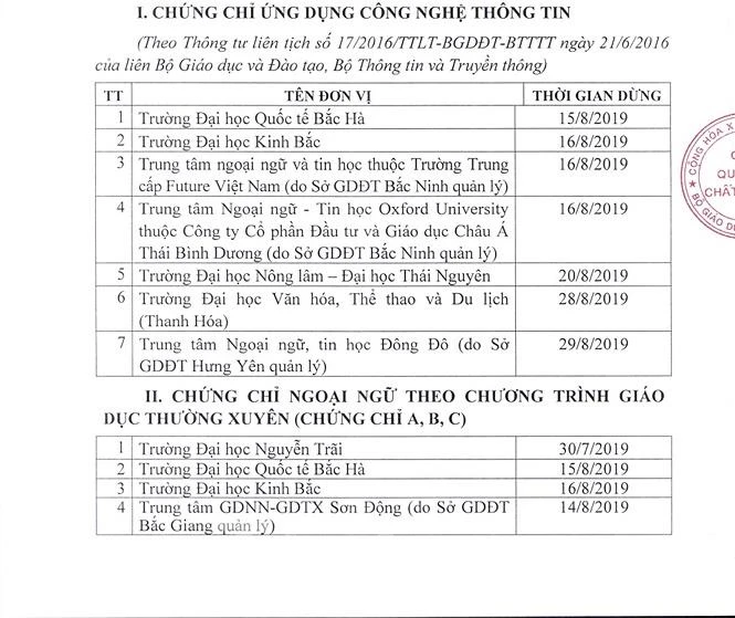 Dưới đây là danh sách các đơn vị phải dừng cấp chứng chỉ công nghệ thông tin và ngoại ngữ.