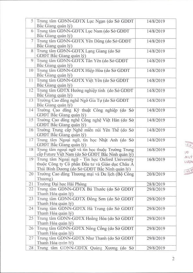 Đối với chứng chỉ ngoại ngữ theo chương trình giáo dục thường xuyên (chứng chỉ A, B, C), Cục Quản lý chất lượng yêu cầu 42 đơn vị dừng kiểm tra, sát hạch, cấp chứng chỉ. Trong đó có Trường ĐH Nguyễn Trãi, Trường ĐH Quốc tế Bắc Hà, Trường ĐH Kinh Bắc, các trung tâm GDNN-GDTX Sơn Động, Lục Ngạn, Lục Nam, Yên Dũng, Lạng Giang, Tân Yên, Hiệp Hòa, Việt Yên do Sở GD&ĐT tỉnh Bắc Giang quản lý...