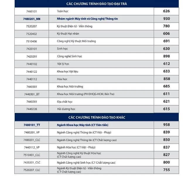 Theo công bố kết quả của Trường ĐH Khoa học tự nhiên (ĐH Quốc gia TP.HCM), năm nay điểm chuẩn theo kết quả thi đánh giá năng lực của trường từ 611 điểm ở ngành Khoa học môi trường (Phân hiệu Bến Tre) và cao nhất là 958 điểm ở ngành Khoa học máy tính ICT tiên tiến, cao thứ nhì là nhóm ngành Máy tính và công nghệ thông tin.