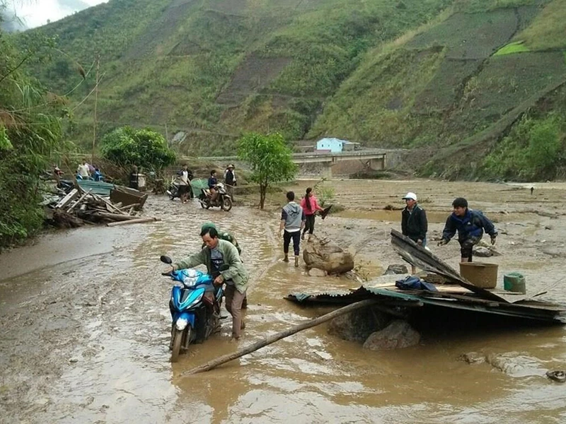 Hỗ trợ người dân Lai Châu khắc phục hậu quả trận mưa đá kèm theo gió lốc. Ảnh: TTXVN