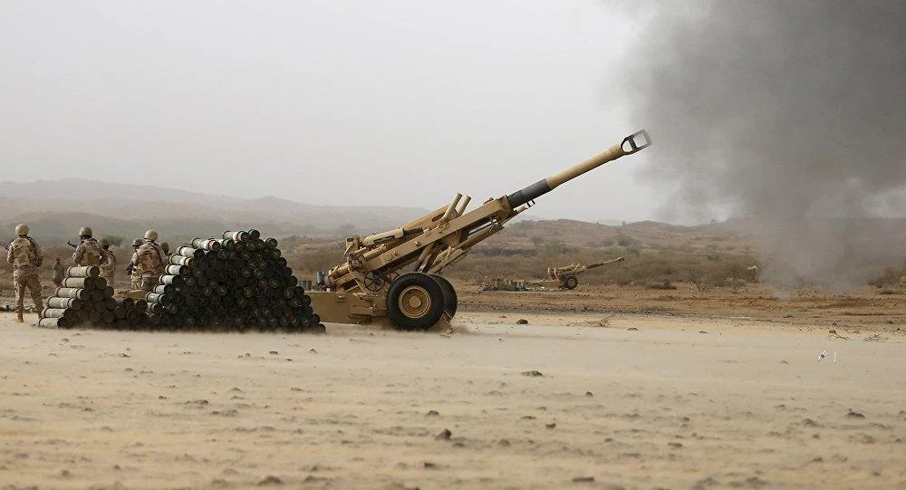 Quân đội Saudi Arabia bắn pháo qua phía phiến quân Houthi, tại khu vực giáp biên giới với Yemen năm 2015. Ảnh: REUTERS