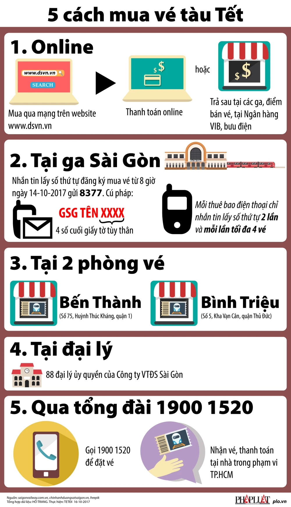 (PLO)- Theo ông Lê Quốc Trung, Phó Tổng Giám đốc Công ty Vận tải đường sắt Sài Gòn, có năm hình thức để mua vé tàu Tết: