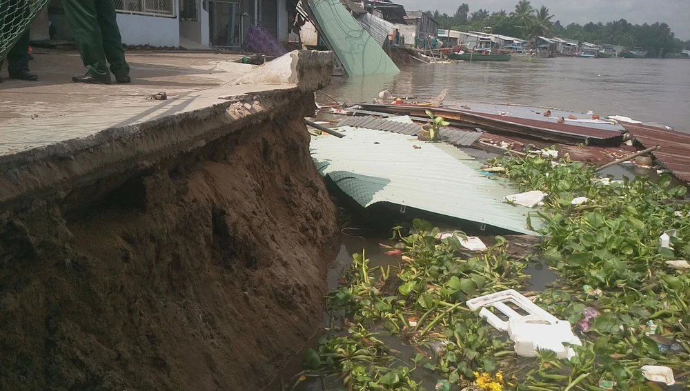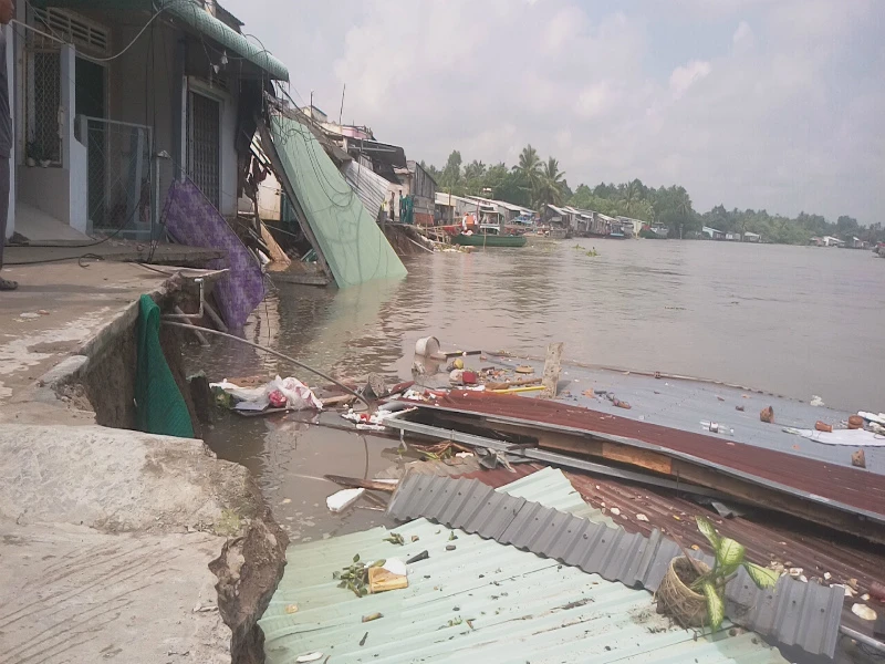 Điểm sạt lở cũ tiếp tục sạt lở khiến năm căn nhà sụp xuống sông hoàn toàn.