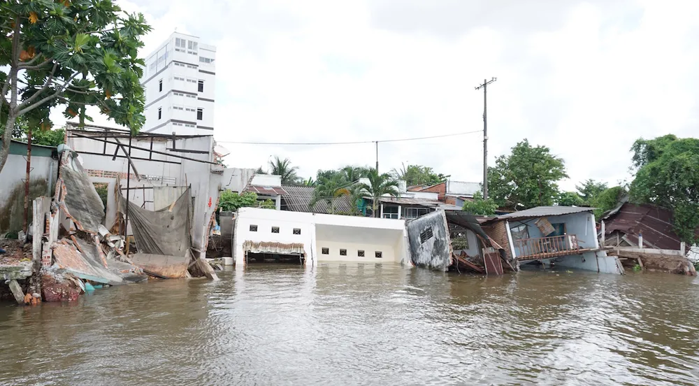 “Sạt lở diễn ra từ từ và ngày càng nghiêm trọng. Sáng 23-6 các ngôi nhà bắt đầu sụp một phần phía sau, hướng cặp sông. Đến khoảng 2 giờ sáng nay thì phần còn lại của dãy nhà đã sụp hoàn toàn xuống nước” - ông Quốc nói.