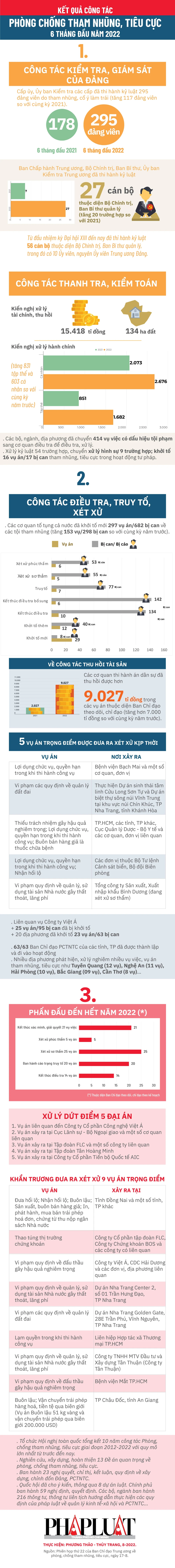 (PLO)- Trong sáu tháng đầu năm 2022 có 27 cán bộ thuộc diện Bộ Chính trị, Ban Bí thư quản lý bị kỷ luật; 295 đảng viên bị thi hành kỷ luật do tham nhũng, cố ý làm trái; 5 vụ án trọng điểm đã kịp thời được đưa ra xét xử.