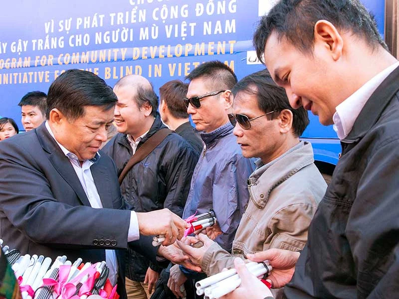 Sáng kiến “Cây gậy trắng cho người mù Việt Nam” là một trong những hành động thiết thực lan tỏa thành quả phát triển cho những người yếu thế. Trong ảnh: Bộ trưởng Nguyễn Chí Dũng trao “cây gậy trắng” cho người mù Việt Nam hôm 5-12-2019. Ảnh: LÊ TIÊN