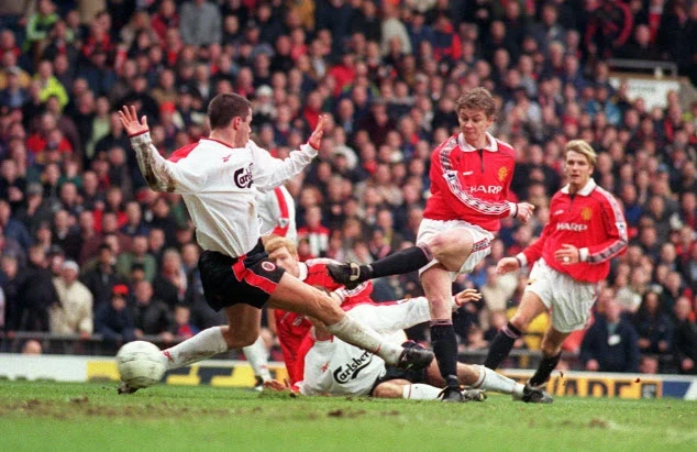 Solskjaer bây giờ là HLV của MU trong khoảnh khắc ghi bàn vào lưới Liverpool. ẢNH: NEWS GROUP NEWSPAPER LTD