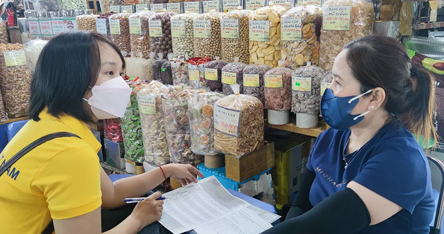 Nhân viên bưu điện đang tư vấn quyền lợi khi tham gia BHXH tự nguyện cho tiểu thương chợ Bến Thành. Ảnh: NGUYỄN HIỀN