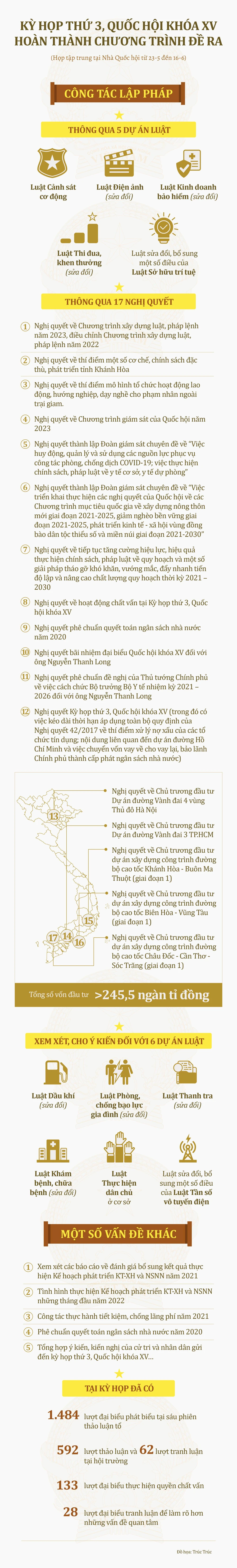 (PLO)- Sau 19 ngày làm việc nghiêm túc, trách nhiệm, kỳ họp thứ 3 Quốc hội khóa XV đã thành công tốt đẹp. Quốc hội đã thông qua năm dự án luật; 17 Nghị quyết; xem xét, cho ý kiến sáu dự án luật cùng nhiều vấn đề quan trọng về kinh tế - xã hội của đất nước.