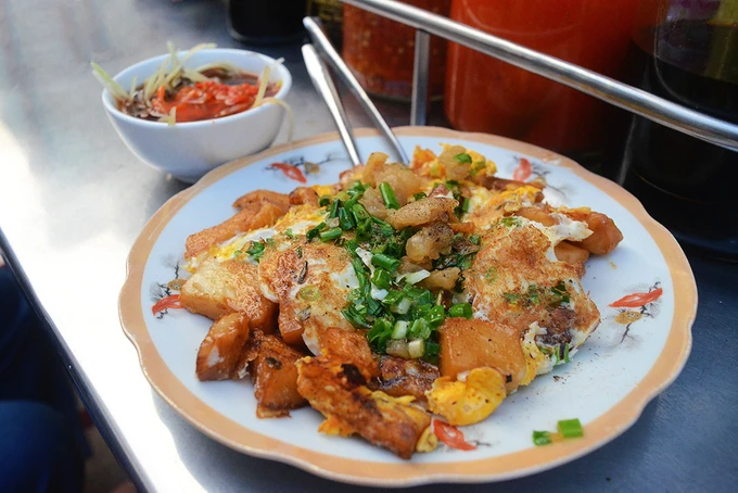 Thông thường, đầu bếp áo một lớp bột màu vàng bắt mắt, trước khi chiên bột trên chảo to cho đến khi lớp bên ngoài giòn. Kế đến, đầu bếp đập trứng trực tiếp lên trên, thêm ít hành lá, đợi đến khi trứng vừa chín tới là múc ra đĩa. Đĩa bột chiên mang ra cho thực khách không thể thiếu chén nước chấm được pha từ nước tương, tương ớt, có thêm đu đủ bào sợi ngâm chua. Ảnh: Phong Vinh