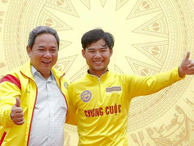 Phó Chủ tịch Liên đoàn Xe đạp - Mô tô Việt Nam Ngô Quang Vinh (trái) chúc mừng nỗ lực vượt bậc của Lê Nguyệt Minh chống chọi với tai nạn quái ác sau năm năm và trở lại với cú đúp áo vàng, áo xanh. Ảnh: MINH QUANG