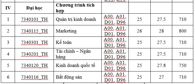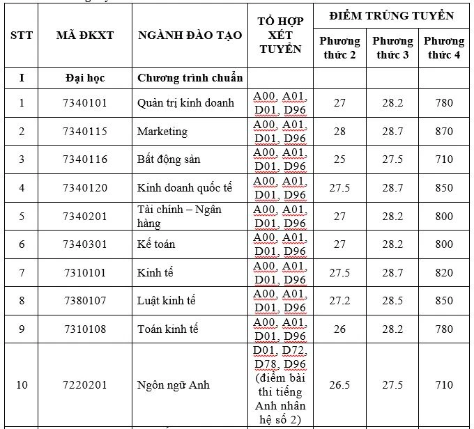 Trong đó, 5 ngành có mức điểm trúng tuyển ba phương thức ở top cao nhất là Marketing, Kinh doanh quốc tế, Luật quốc tế, Kinh tế và Công nghệ tài chính.