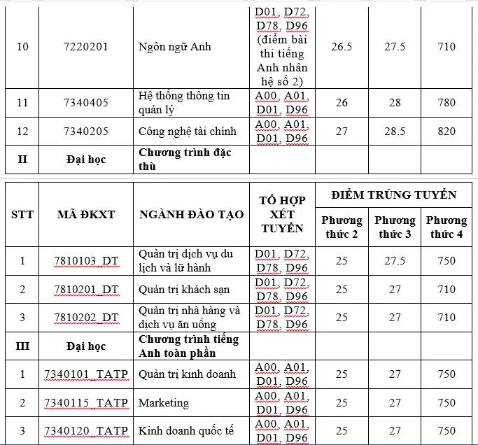 Đáng chú ý, trong 24 ngành học thuộc 4 chương trình đào tạo của trường, điểm chuẩn ở các phương thức đều ở mức cao. Cụ thể, ở phương thức xét điểm học bạ theo tổ hợp ba môn, thí sinh phải mỗi môn ít nhất 8 điểm mới có thể trúng tuyển, có những ngành mỗi môn phải từ 9 điểm trở lên. Còn ở phương thức xét điểm đánh giá năng lực, mức điểm từ 710 đến 870, theo thang điểm 1.200.