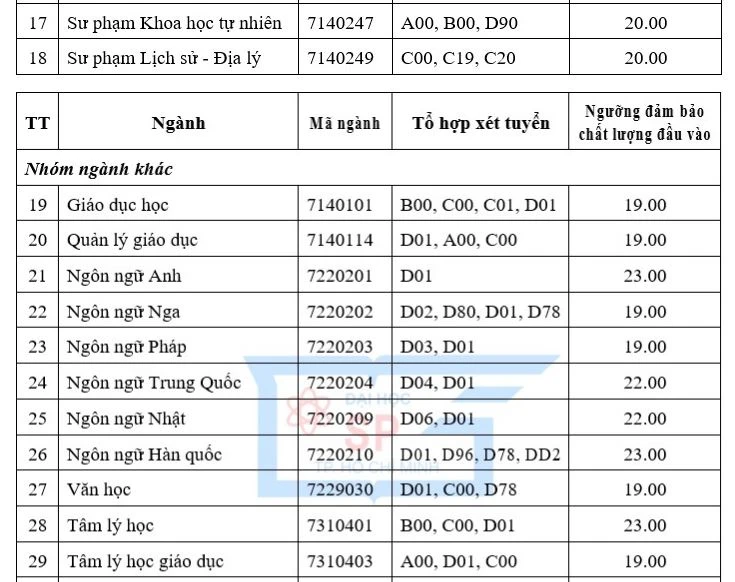 Còn với các ngành đào tạo ngoài sư phạm, điểm sàn năm nay ở mức từ 19 đến 23 điểm. Trong đó, cao nhất là Ngôn ngữ Anh và Tâm lý học với 23 điểm.