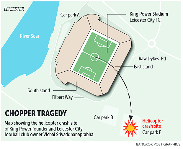 Theo kế hoạch, sau trận đấu của Leicester City, chiếc trực thăng này sẽ chở ông Vichai và đoàn tùy tùng ra sân bay quốc tế Luton để tỉ phú Thái Lan đáp chuyến bay về Bangkok. Tuy nhiên, khi chiếc trực thăng vừa bay khỏi mặt sân thì đã gặp trục trặc kỹ thuật và rơi xuống đất cháy nổ. tạo thành quả cầu lửa khổng lồ phía ngoài sân King Power.