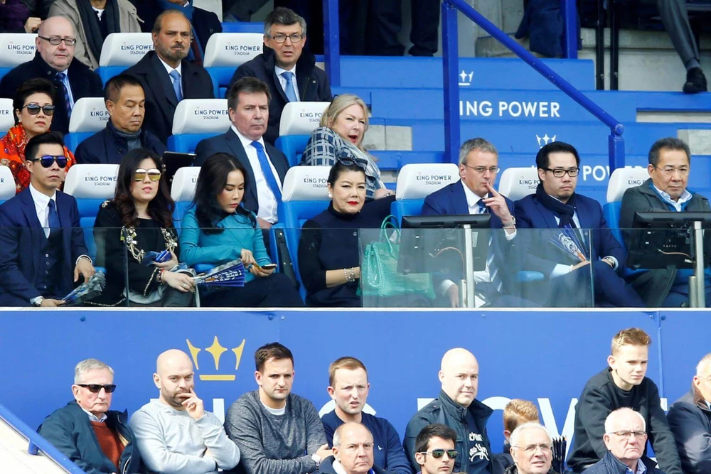 Dãy trên bìa phải là cha con tỉ phú Vichai, người đàn ông ngồi hàng sau phía trên gần người phụ nữ choàng khăn đỏ là Chủ tịch LĐBĐ Thái Lan - ông Somyot.