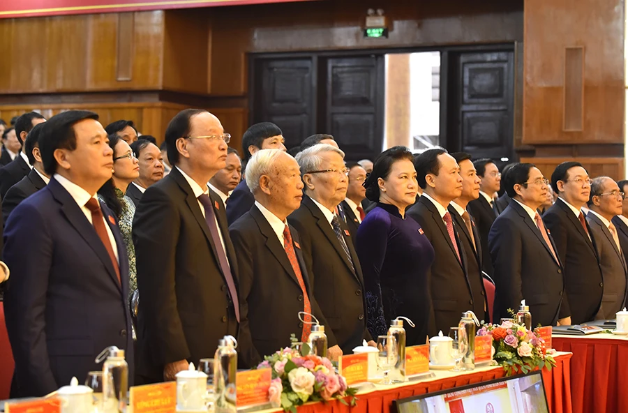 Chủ tịch Quốc hội Nguyễn Thị Kim Ngân cùng nhiều lãnh đạo, nguyên lãnh đạo Đảng và nhà nước dự Đại hội Đảng bộ tỉnh Thanh Hóa. Ảnh: Đ.TRUNG