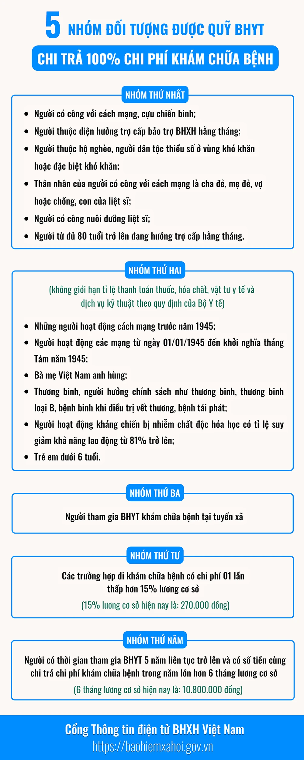 Cạnh đó, nhóm người được BHYT chi trả 100% chi phí khi đi khám chữa bệnh đúng tuyến gồm: