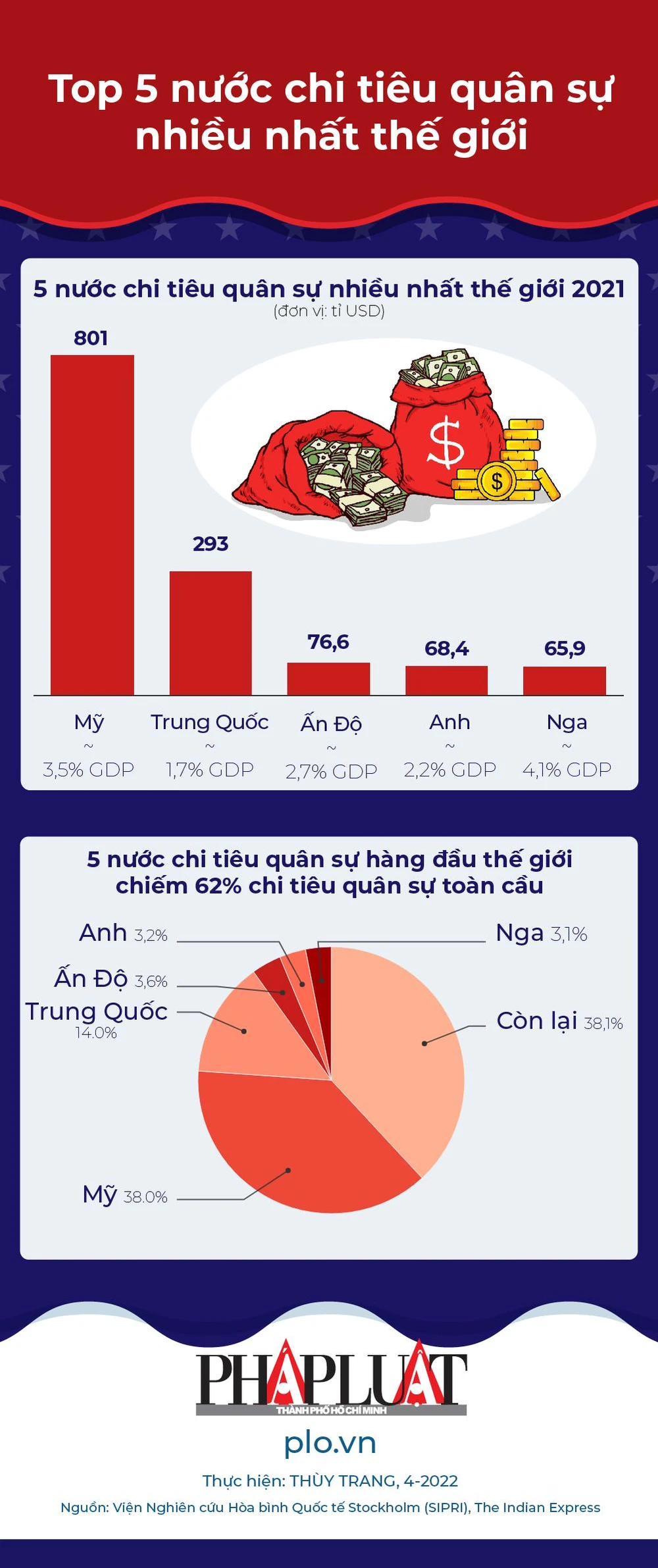 (PLO)-  Viện Nghiên cứu Hòa bình Quốc tế Stockholm (SIPRI) vừa công bố 5 nước chi tiêu quân sự nhiều nhất thế giới gồm Mỹ, Trung Quốc, Ấn Độ, Anh và Nga, chiếm 62% chi tiêu quân sự toàn cầu. Số liệu cụ thể như sau.