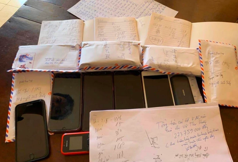 Công an bắt hai người này, bắt thêm ba chủ “đại lý” là Nguyễn Thị Hiền (53 tuổi), Hoàng Thị Vui (33 tuổi) và Nguyễn Thị Ân (46 tuổi), cùng trú huyện Quỳnh Lưu. Tang vật là 296 triệu đồng, 710.000 yen Nhật, 13 điện thoại, hai laptop, 38 bảng đề và nhiều tang vật khác.