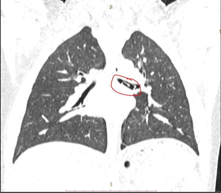 Hình ảnh CT scan xác định dị vật trong phế quản bé trai. Ảnh: BVCC