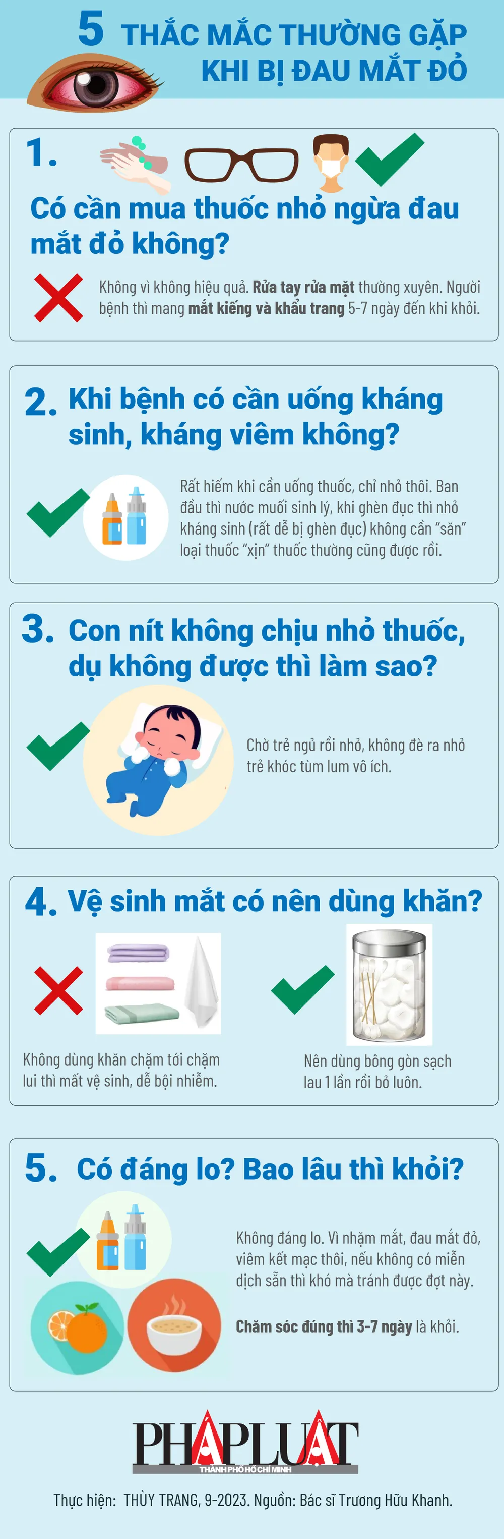 (PLO)- Dịp tựu trường năm nay là lúc các bệnh viện ở TP.HCM ghi nhận nhiều trẻ bị đau mắt đỏ (còn gọi viêm kết mạc cấp). Sau đây là lời khuyên của bác sĩ Trương Hữu Khanh trả lời 5 thắc mắc thường gặp khi bị đau mắt đỏ.