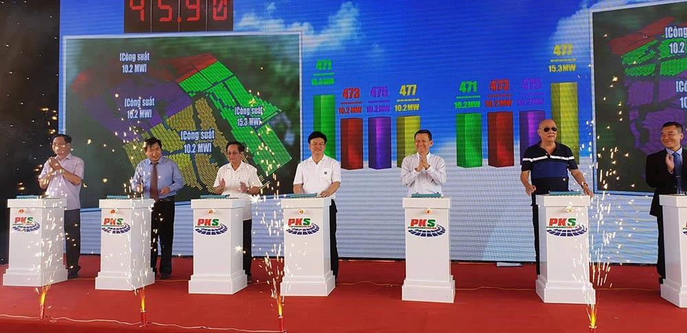Nghi thức khánh thành và gắn biển chào mừng tổ hợp nhà máy điện mặt trời Xuân Thọ 1 và Xuân Thọ 2. Ảnh: TẤN LỘC