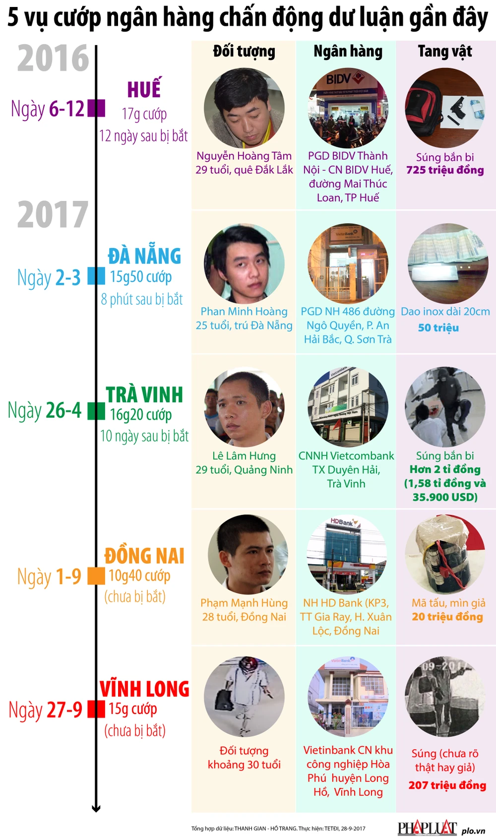 (PLO)- Từ tháng 12-2016 đến nay đã có năm vụ cướp ngân hàng gây chấn động dư luận.