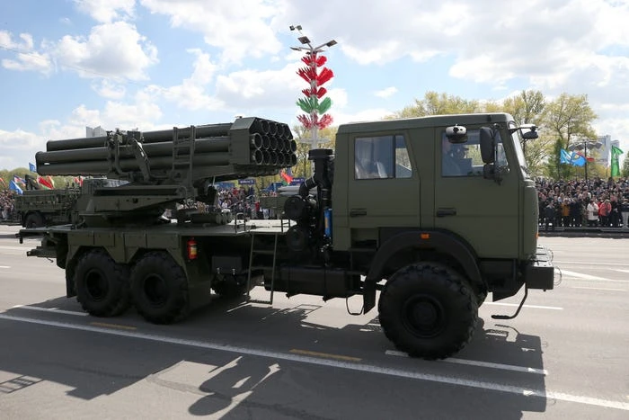 Pháo phản lực bắn loạt Uragan-1M gắn trên xe tải. Ảnh: Natalia Fedosenko/TASS/ GETTY IMAGES