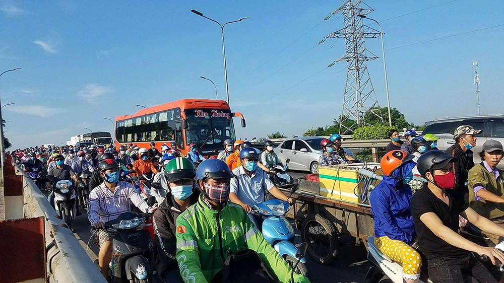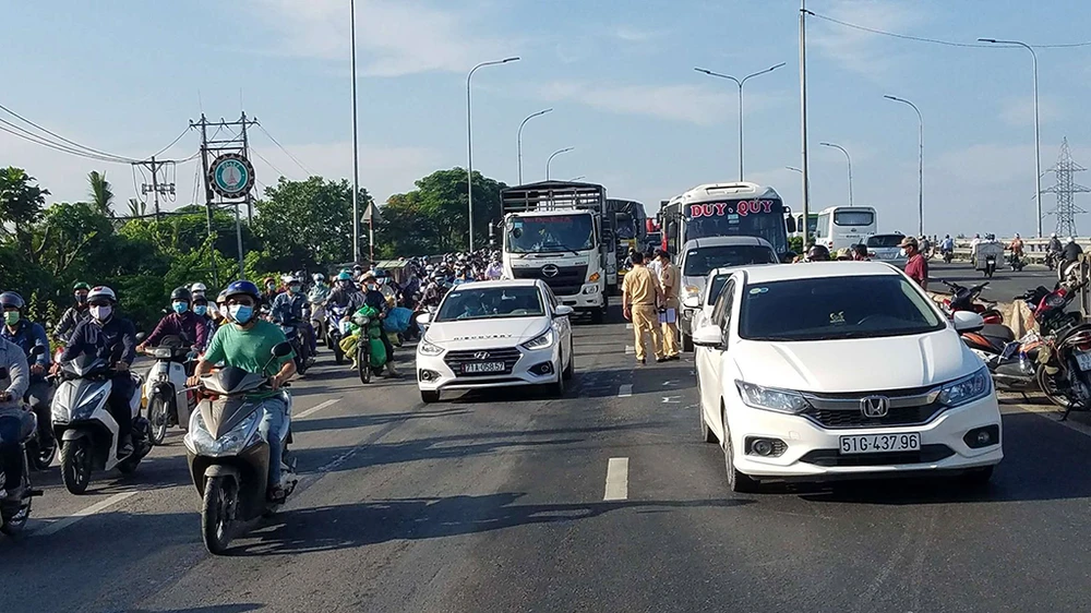 Sáng 24-8, dòng xe chạy trên Quốc lộ 1, hướng từ miền Tây đi TP.HCM, khi đổ dốc cầu Bình Điền (xã Tân Kiên, huyện Bình Chánh, TP.HCM) thì xảy ra va chạm liên hoàn giữa 5 ô tô.