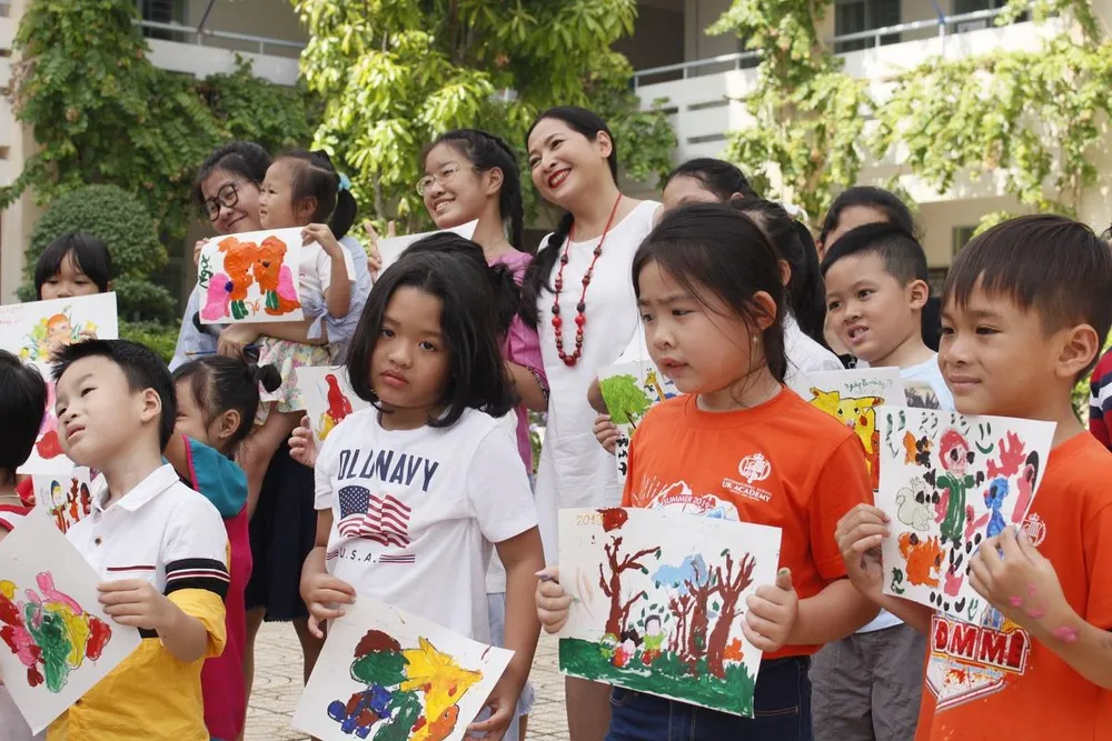 MC Quỳnh Hương cùng các bé chụp hình với những bức tranh đã hoàn thiện.