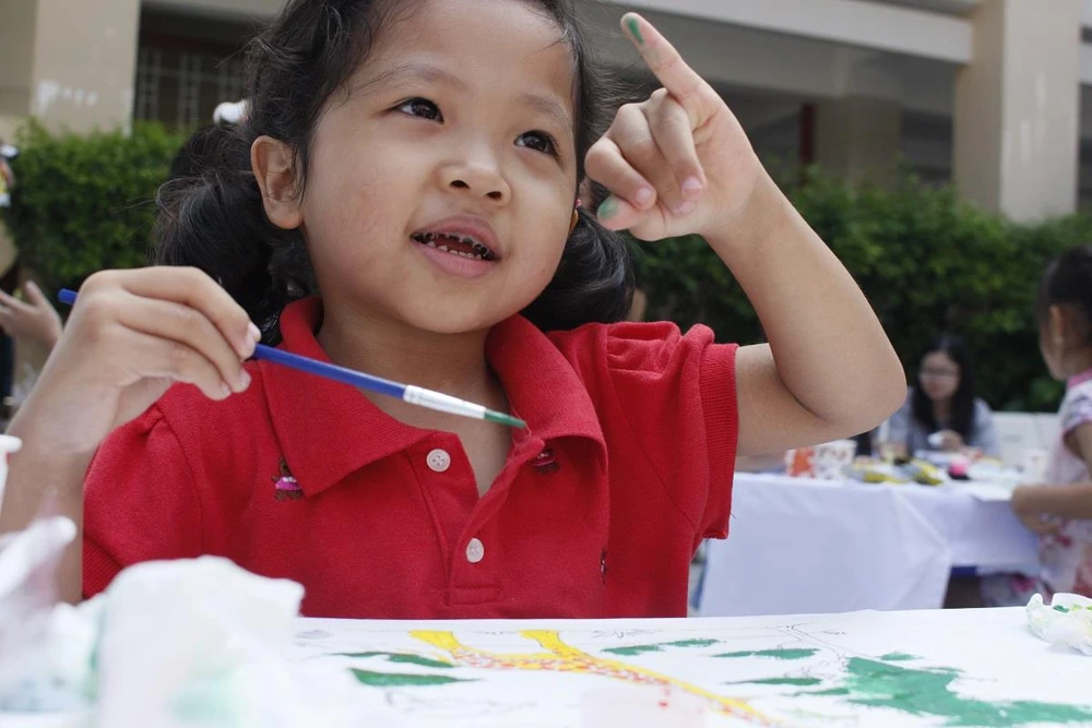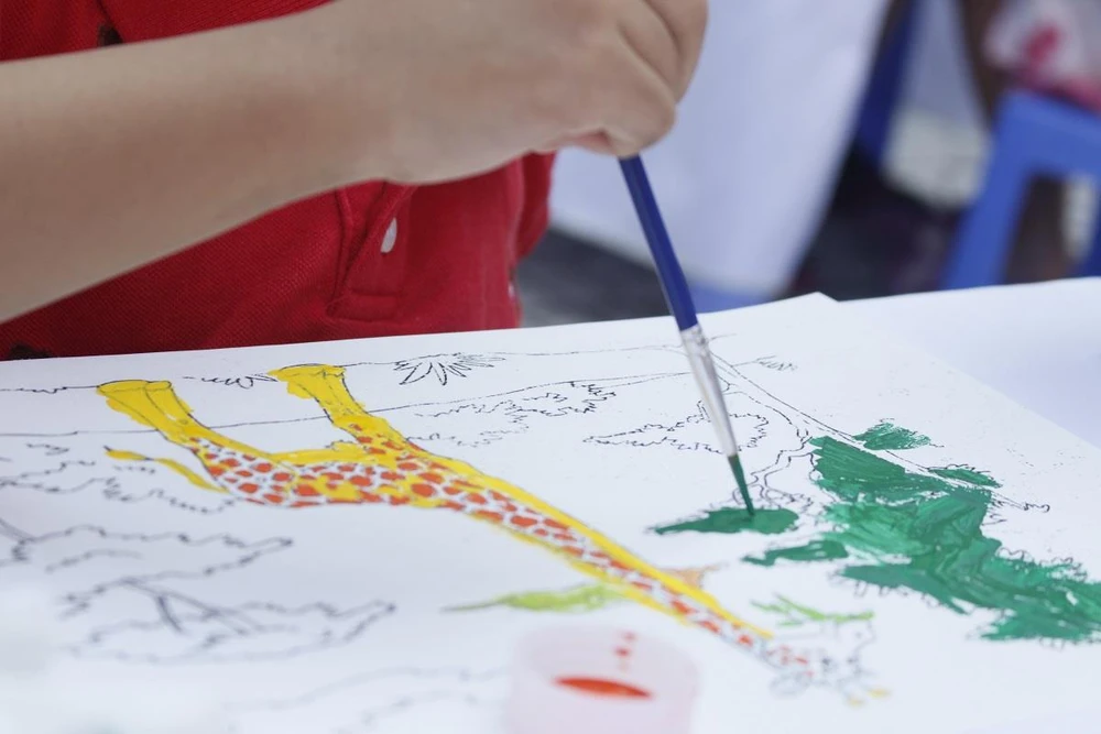 Bé Nguyễn Quỳnh Lam thích thú khi được tự do tô màu trên bức tranh của mình.