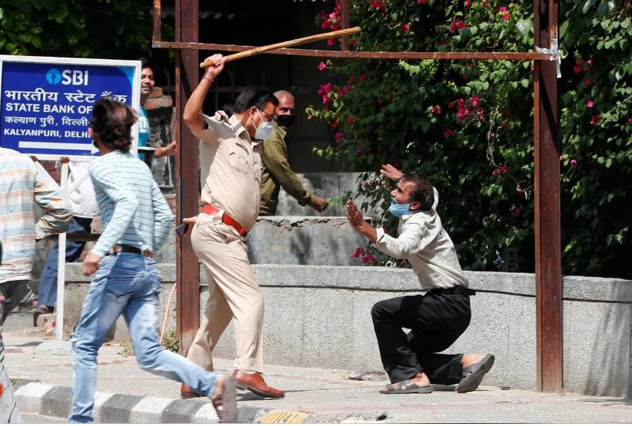 Cảnh sát dọa đánh một người vi phạm thực hiện giãn cách xã hội khi xếp hàng chờ mua rượu ở New Delhi (Ấn Độ) ngày 4-5. Ảnh: REUTERS