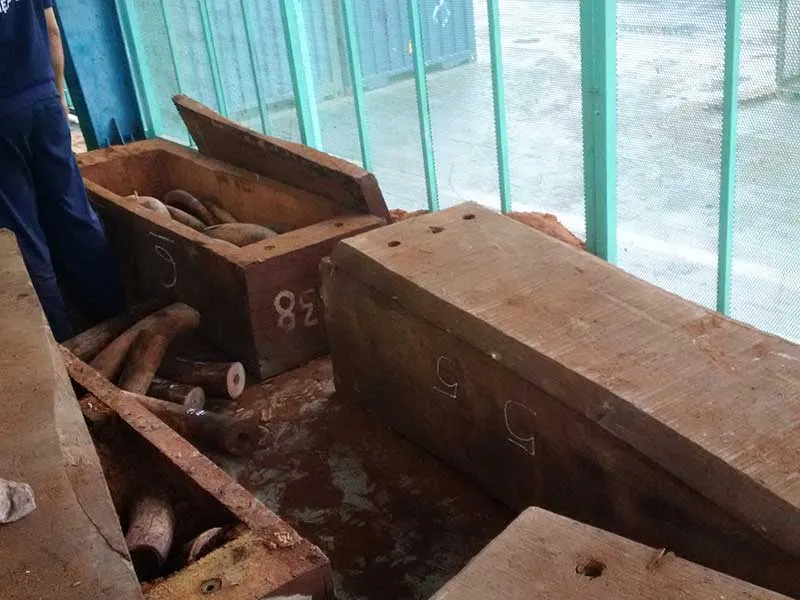 Các hộp gỗ được bóc ra, phát hiện khoảng 500 kg nghi ngà voi. Ảnh: TU