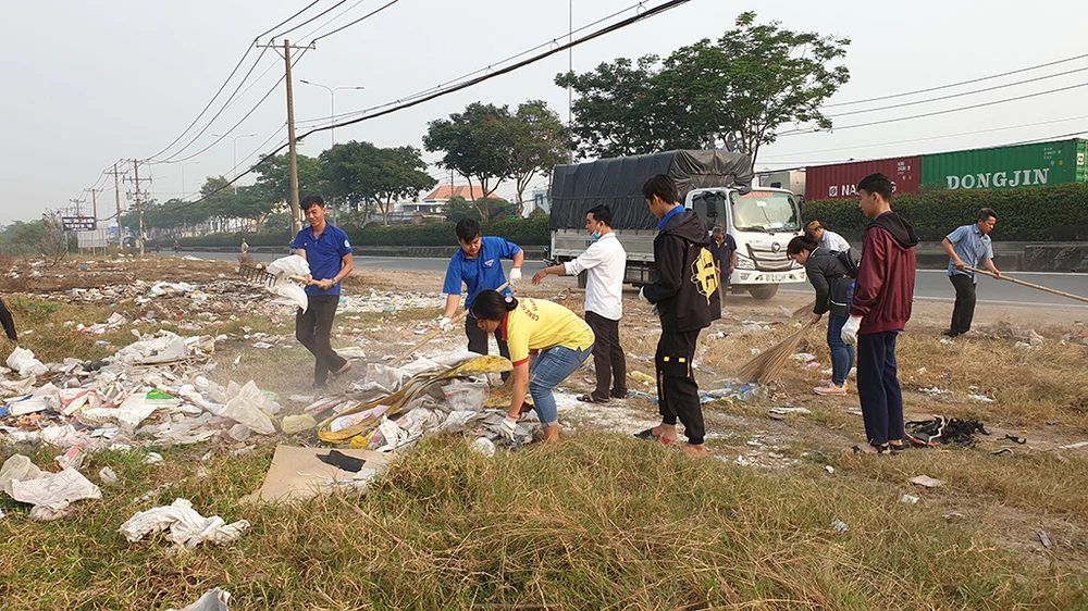 500 người đã tập trung ở dọc quốc lộ 22 đoạn qua huyện Hóc Môn và nhiều tuyến đường khác để dọn dẹp, vệ sinh môi trường. Ảnh: NT