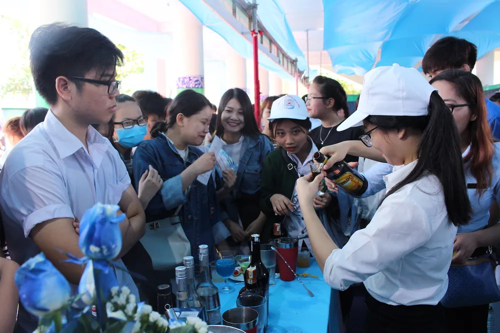 Các em học sinh THPT thực sự bị thu hút trước các ngành nghề du lịch, nhà hàng, khách sạn. Thầy cô Trường cao đẳng nghề Đà Nẵng trình diễn cách pha chế đồ uống. Ảnh: KIỀU TÂM.