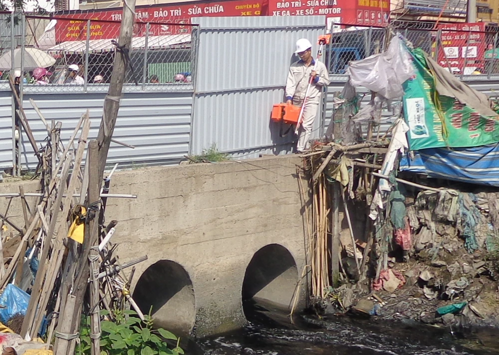 Cống bên dưới gồm hai ống cống, đường kính 1 m nên nước trên kênh Tham Lương khó lưu thoát giữa thượng và hạ lưu.