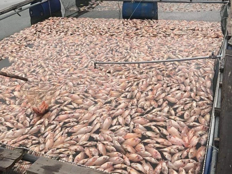 Cá điêu hồng đồng loạt chết đỏ lồng, người dân có nguy cơ trắng tay. Ảnh CTV