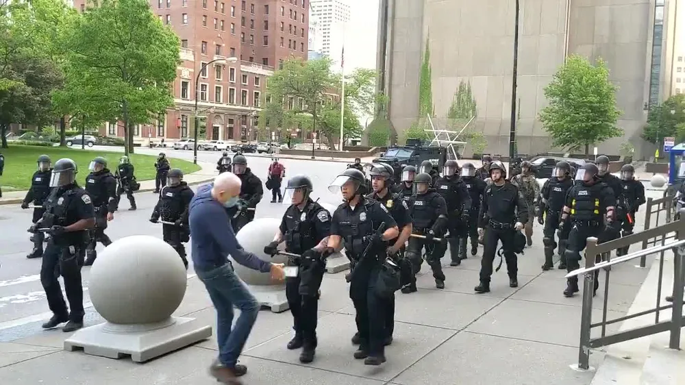Một đoạn video ghi lại cuộc biểu tình hôm 4-6 cho thấy người đàn ông lớn tuổi tiếp cận nhóm cảnh sát đang dàn hàng ngang để xử lý biểu tình ở quảng trường Niagara.