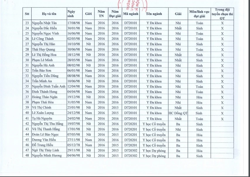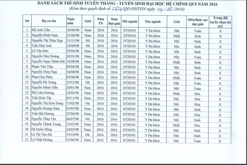 Dưới đây là danh sách thí sinh trong diện tuyển thẳng của ĐH Y Hà Nội: