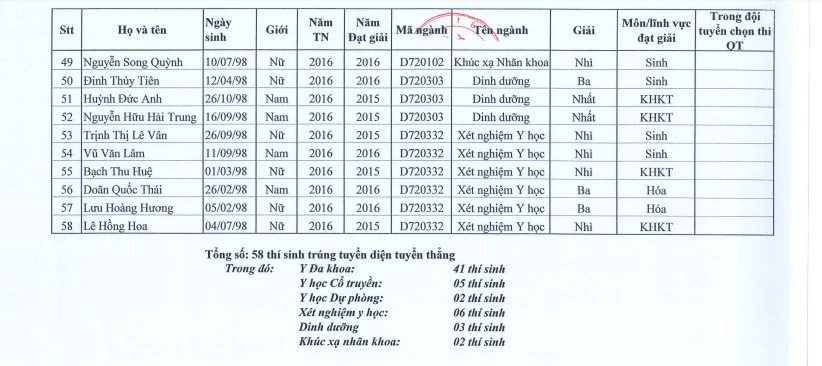 Theo đó, ĐH Y Hà Nội đã công nhận 58 thí sinh trúng tuyển diện tuyển thẳng vào các ngành y đa khoa, y học cổ truyền, khúc xạ nhãn khoa, dinh dưỡng, xét nghiệm y học.