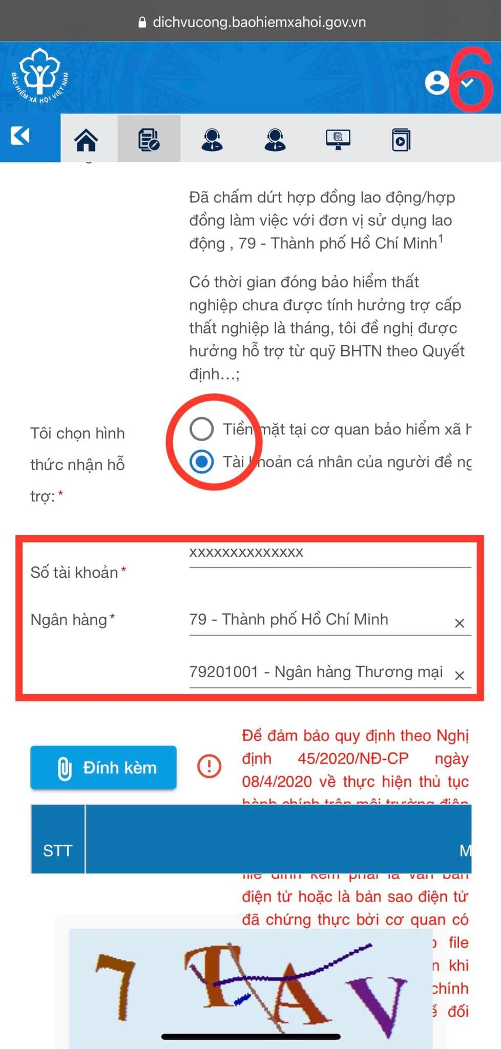 + Chọn phương thức nhận hỗ trợ bằng “TIỀN MẶT” hoặc qua “TÀI KHOẢN” (Nhập số tài khoản ngân hàng, chọn chi nhánh Ngân hàng)