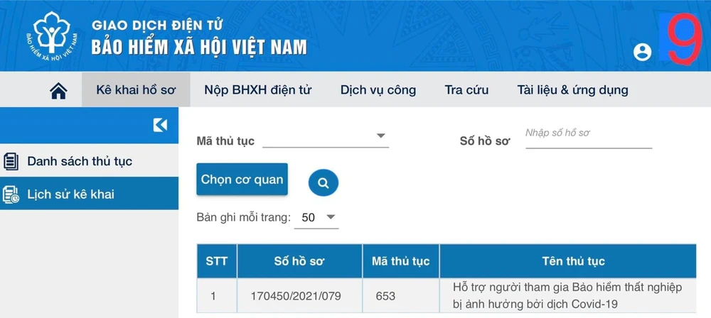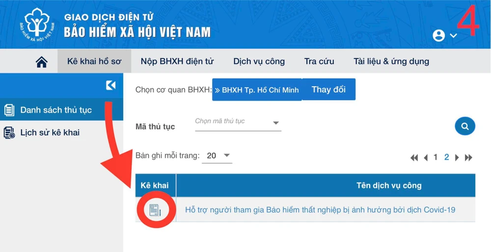 Bước 4: Chọn thủ tục “HỖ TRỢ NGƯỜI THAM GIA BHTN BỊ ẢNH HƯỞNG BỞI DỊCH COVID-19”