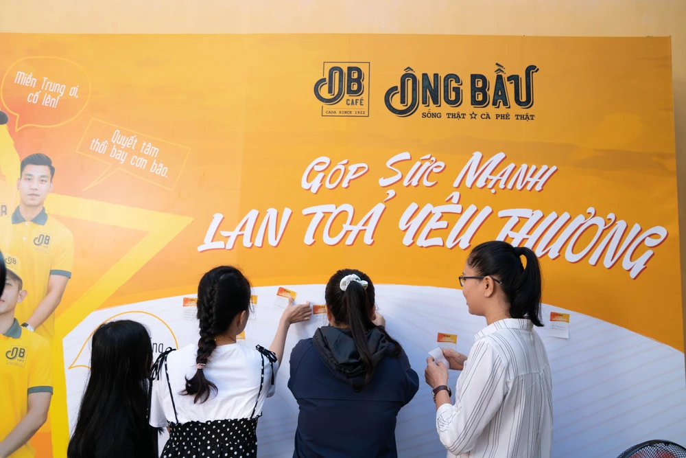 Tại buổi giao lưu, các “fan” được khuyến khích viết lời động viên dành tặng đồng bào miền Trung. Với mỗi lời động viên, cà phê Ông Bầu sẽ trích 16.000 đồng/lời chúc để gây quỹ “Đóng thuyền vượt bão” dành tặng cho đồng bào nơi đây.