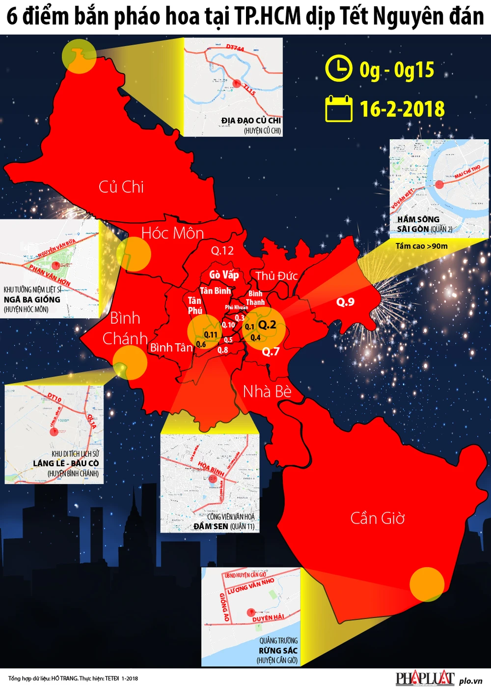 (PLO)- Tết Nguyên đán năm nay, TP.HCM sẽ tổ chức bắn pháo hoa tại 6 điểm, gồm một điểm tầm cao và năm điểm tầm thấp.Thời gian bắn kéo dài 15 phút bắt đầu từ 0h đến 0h15 ngày 16-2-2018.