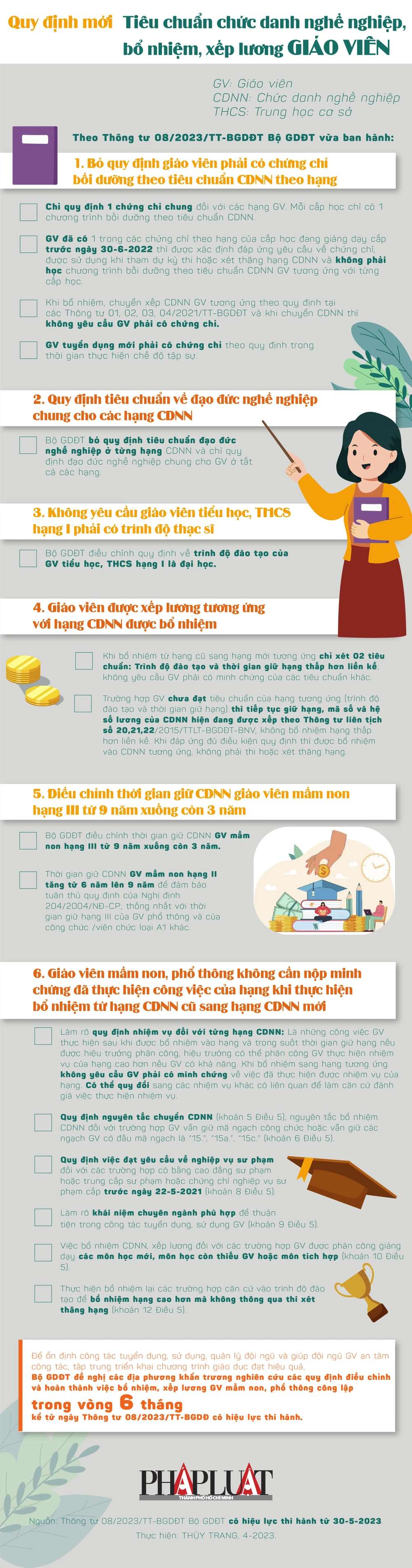 (PLO)- Đây là 6 điểm mới về tiêu chuẩn chức danh nghề nghiệp, bổ nhiệm, xếp lương giáo viên giảng dạy trong các cơ sở giáo dục mầm non, phổ thông công lập từ tháng 5-2023 theo Thông tư 08/2023 của Bộ Giáo dục và Đào tạo vừa ban hành.