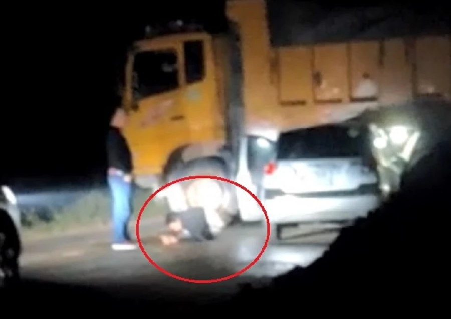 Nạn nhân Bách tại thời điểm sau khi va chạm với xe tải (khoanh đỏ)