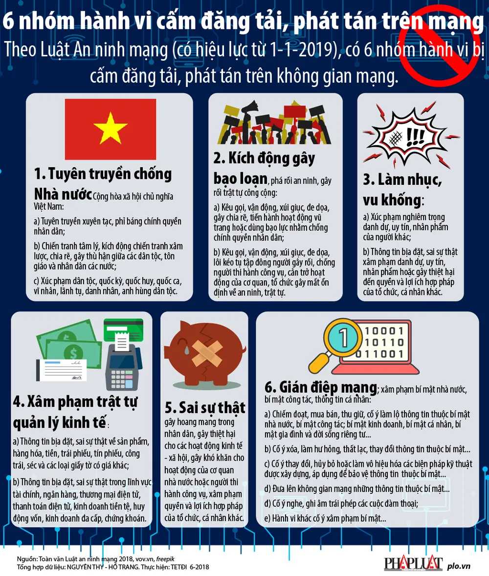 (PLO)- Theo Luật An ninh mạng (có hiệu lực từ ngày 1-1-2019), có sáu nhóm hành vi bị cấm đăng tải, phát tán trên không gian mạng.