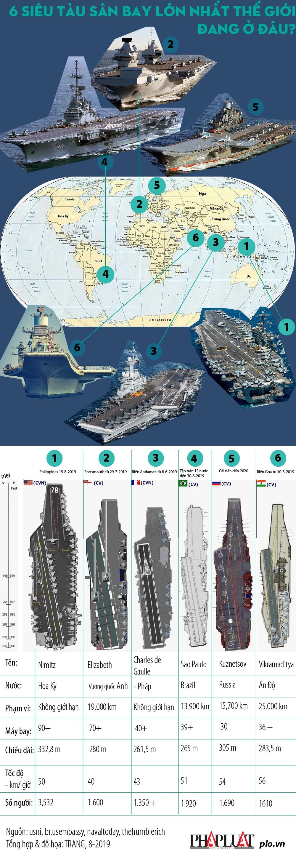 (PLO)- Dưới đây là sơ nét vị trí của sáu tàu sân bay lớn nhất thế giới tính đến tháng 8-2019.