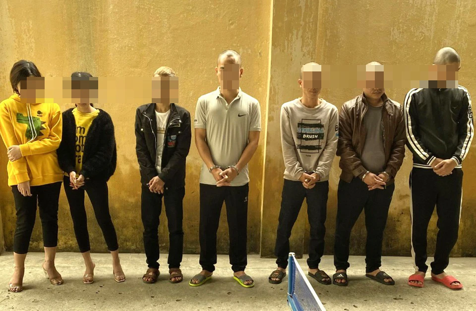Bảy người gồm năm nam và hai nữ bị Công an huyện Tĩnh Gia bắt quả tang khi đang tổ chức sử dụng ma túy. Ảnh: T.THANH